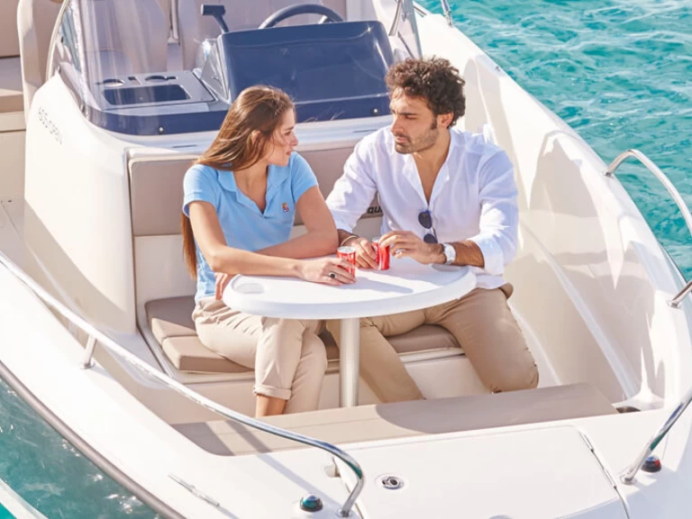 Sal a navegar con hasta 7 personas a bordo y explora las grandes características que te ofrece esta embarcación de seis metros de eslora versátil y divertida con un motor Mercury de 115 CV te garantizará un arranque rápido y una navegación segura. Dispone de solárium de proa desmontable con colchonetas, plataforma con escalera de baño. Para las comidas y el descanso dispone de mesa desmontable, toldo bimini para el sol y equipo de música FM y conexión bluetooth. Material de snorkel disponible y también ofrecemos actividades extras opcionales a elegir a la hora de reservar, no dudes en consultarnos. Se necesita mínimo licencia de navegación básica. Opción de acompañante(Armador) Consultar precio Se encuentra en el puerto de Juan Montiel.