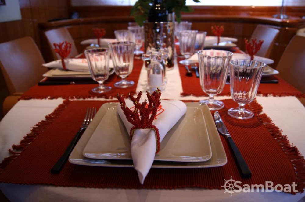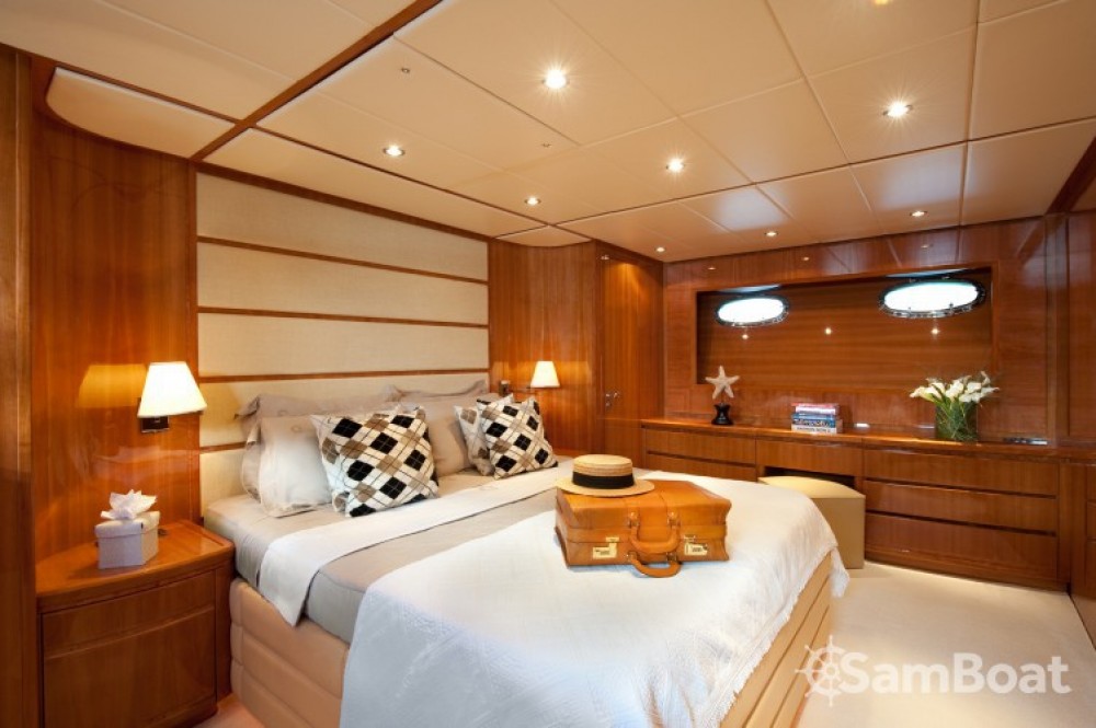 Ce magnifique bateau est disponible avec quatre membres d'équipage Vous bénéficiez de 4 cabines, deux doubles, et deux twins Vous disposez dans le bateau de tout le matériel de plongée, d'équipements pour les sports nautiques (wakeboard, ski, bouée etc ...) Vous retrouverez sur les photos le confort de ce bateau de luxe. Le tarif est à partir de 280000€ HT par semaine. N'hésitez pas à nous envoyer une demande de devis, nous étudierons votre demande