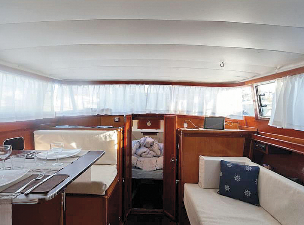 Un cabinato estremamente confortevole dotato di ampio pozzetto con tavolo e sedute, un comodo prendisole a prua con materassini e cuscini, una spaziosa dinette con tavolo trasformabile in cuccette, una cabina armatoriale a 2 posti, angolo cottura e bagno.