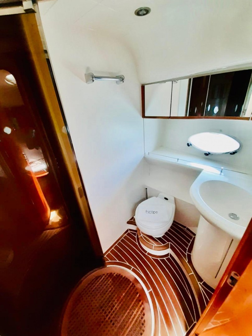En él encontramos todo tipo de detalles que le otorgan la caracterización de yate con altas prestaciones. Se compone, en su interior: de 3 camarotes, 3 baños, un gran salón y una amplia cocina con barra americana; en el exterior: encontramos una cabina abierta a la bañera, formada por 4 lujosos sillones (uno de ellos destinado al control de la embarcación), 2 amplios sofás, 1 mesa anclada a la bañera, una barra apoyar las bebidas; en el exterior (externo a la cabina: 2 solarium (en popa) y 1 solarium (en proa); en popa: plataforma de baño, con escalerilla, y 2 grandes almacenes abatibles de forma electrónica, 1 de ellos en el que se encuentra la embarcación auxiliar semirrígida con un motor Suzuki de 20cv (esta cuenta con consola central, capacidad para 5 personas, y anclaje de remolque), con potencia suficiente para desarrollar las modalidades deportivas acuáticas, que se especifican en los extras.