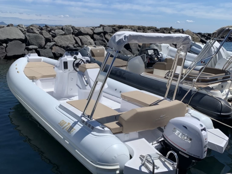 Gommone con lunghezza 7,250 m e larghezza 2,651 m motore installato 40 CV, con capacità di carico fino a 6 persone, ideale per uscite in barca in famiglia o di gruppo.