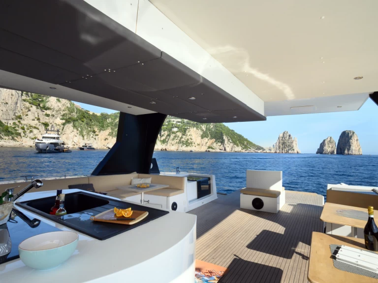 Designed for up to 20 passengers and 2 crew members, this yacht offers ample room to unwind. Stretch out on the spacious bow sundeck or relax in the shaded stern area, complete with a plush sofa and table, ideal for sipping drinks or enjoying a meal.